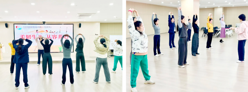 11月3日,海创园党群空间的 “柔韧生光·从容养心”八段锦养生活动,帮助青年在忙碌工作中找到内在平衡。八段锦养生活动