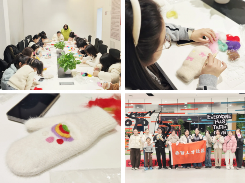 12月21日,在乔智人才社区,“暖手暖心·毡造美好”DIY毛毡手套活动让夜晚变得静谧而专注。青年们一针一线,从一团散乱的材料到独一无二的精美手套,需要极大的耐心。一位从事编程工作的参与者说:“这个过程非常解压,看到成品的那一刻,成就感比修复一个复杂的Bug还大!”这份亲手制作的温暖,实实在在地捧在了掌心。DIY毛毡手套活动现场